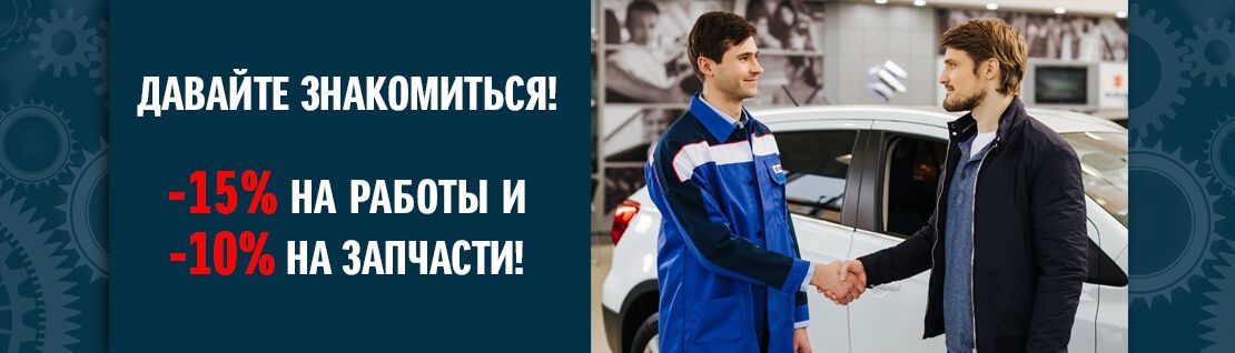 Тогда – давайте знакомиться! Приезжайте к нам на ТО и получите выгоду 15% на работы и 10% на запасные части!